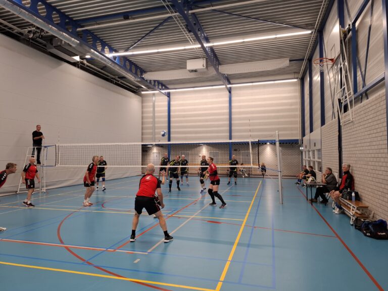 Om weer een beetje terug te komen naar de realiteit spreken we nu dus over de sporthal Achter de Haof, daar waar de clash plaats ging vinden. Echter niet eerder dan dat we de koffie en vlaai genoten hadden. Pup probeerde met extreem grote stukken ons alvast een stukje zwaarder te maken zodat we niet zo hoog zouden springen, maar dat werd weer teniet gedaan door de nethoogte. Deze ligt bij de oude mannen uit Kessel namelijk 8 centimeter lager dan bij die uit het Noorden des lands, makkie dus voor ons…