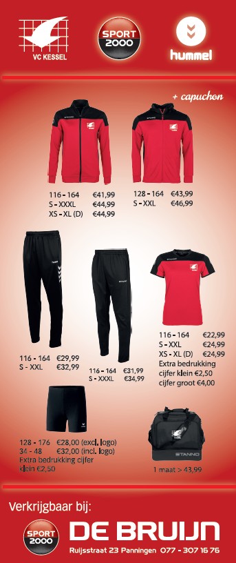 Sportkleding voor VC Kessel leden kan besteld worden bij Sporthuis de Bruijn in Panningen. Een overzicht van beschikbare modellen incl. prijzen en maten vind je hiernaast.